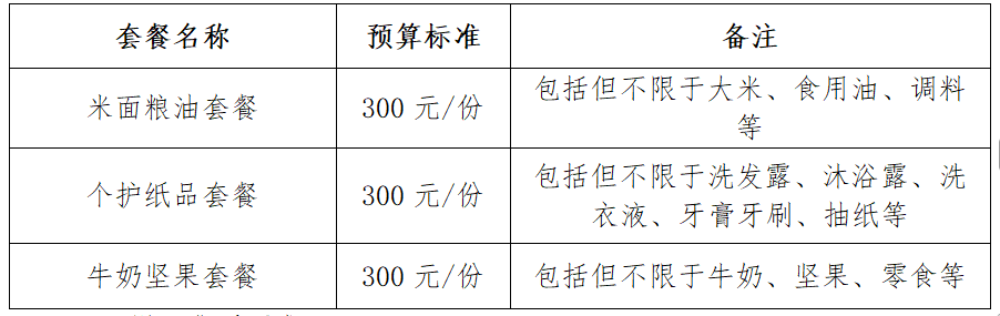 2. ▲套餐实际价值:≥600元/份慰问品(≥300元/份固定套餐),包含商品到达采购人指定交货地点并能正常使用所需的一切费用,包括但不限于商品购置费、包装费、运输费、装卸费、保险费、税费等。